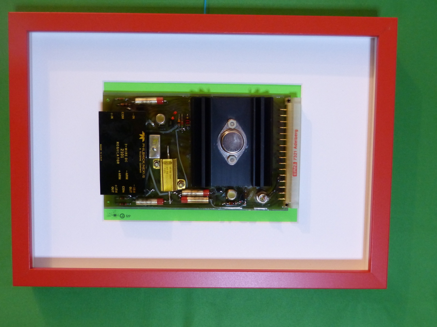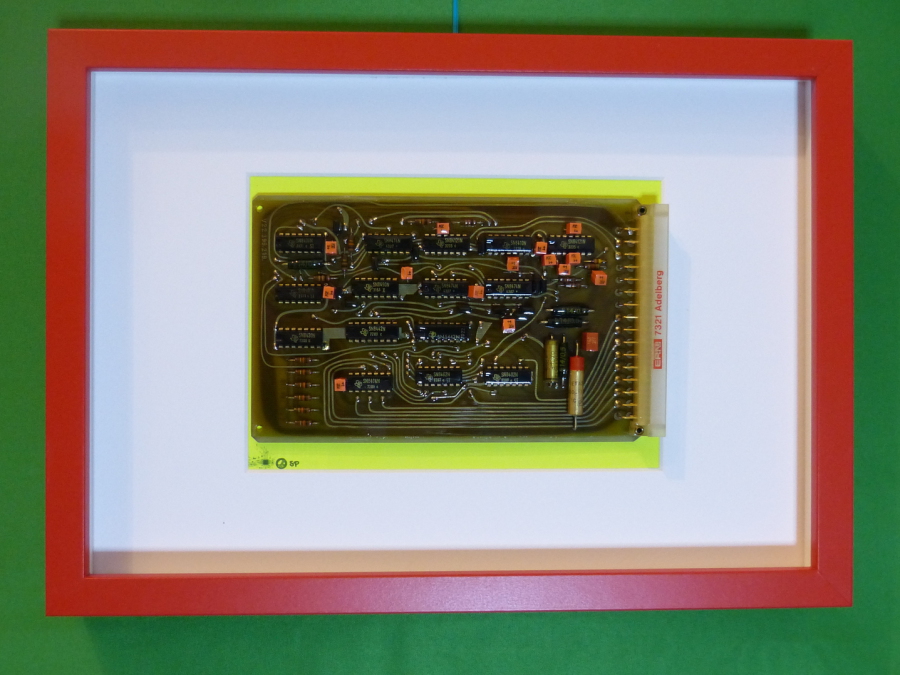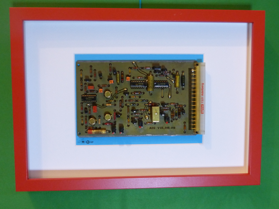 Die alten Platinen stammen aus verschiedensten Geräten und wurden farblich passend gerahmt, um ihre Einzigartigkeit zu betonen.